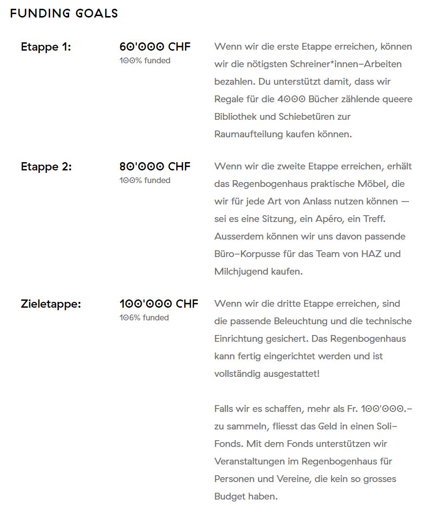 Es ist nicht immer ganz einfach, sich für eine Zielsumme zu entscheiden: Eigentlich würden 10’000 CHF reichen, um das Projekt zu lancieren, aber mit 15’000 CHF könnte man das Projekt vergrössern. In solchen Fällen ist ein Etappenfunding eine gute Wahl, nämlich dann wenn ein Projekt in verschiedengrossen Ausführungen umsetzbar ist.