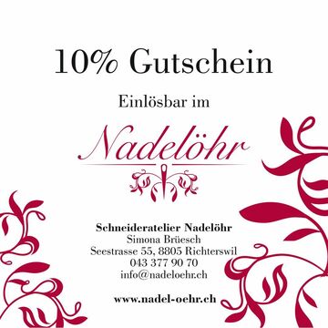 Du erhältst einen 10%-Gutschein auf eine Änderung oder eine Neuanfertigung (exkl. Material) im Schneideratelier Nadelöhr in Richterswil. Gönn dir ein perfekt passendes Lieblingsteil – vom angepasst sitzenden Trainingsoutfit bis hin zu einem ganz neuen Unikat, das nur für dich genäht wird.