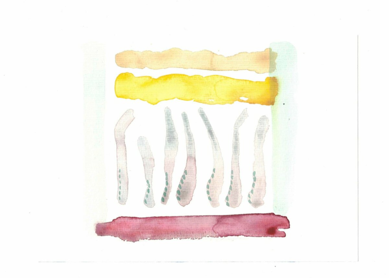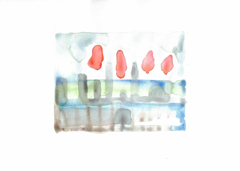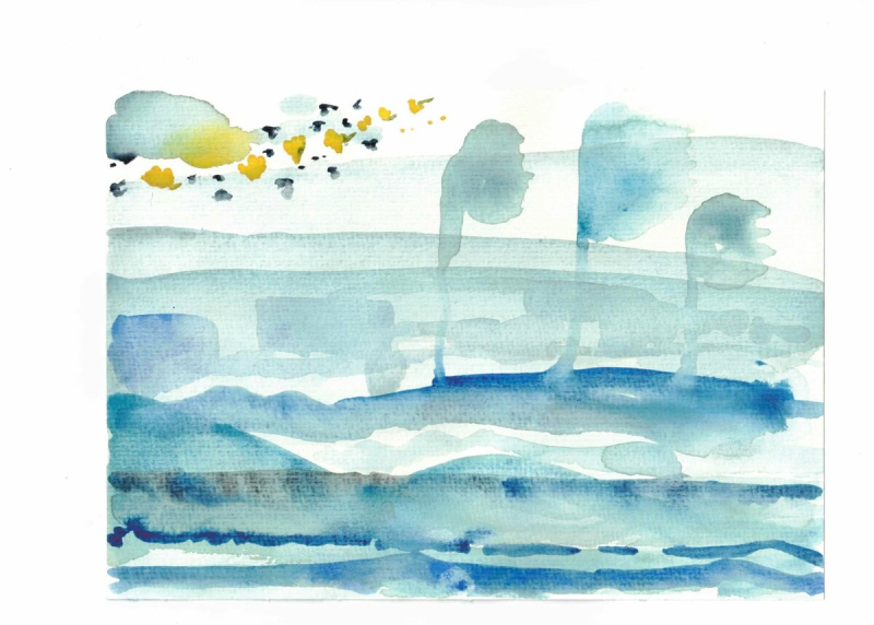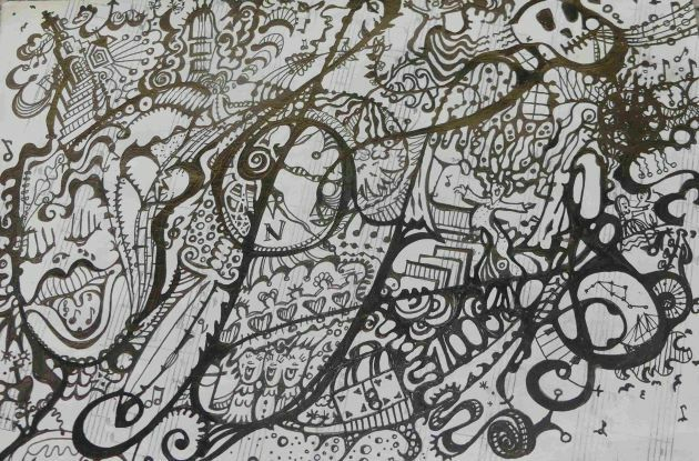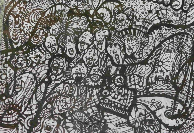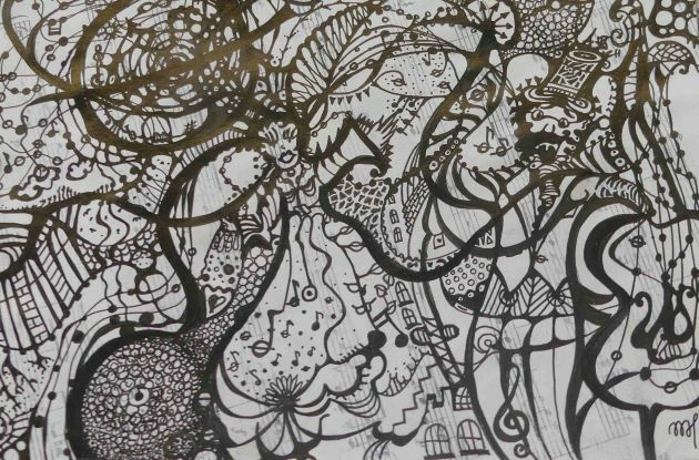 Ein Wimmelbild von Mona Hapke, Format A5, Tusche auf Notenpapier.