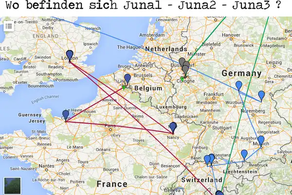 - Juna3 war in Schweden, Hamburg, Düsseldorf, Leichlingen und ist jetzt in Köln (Deutschland)