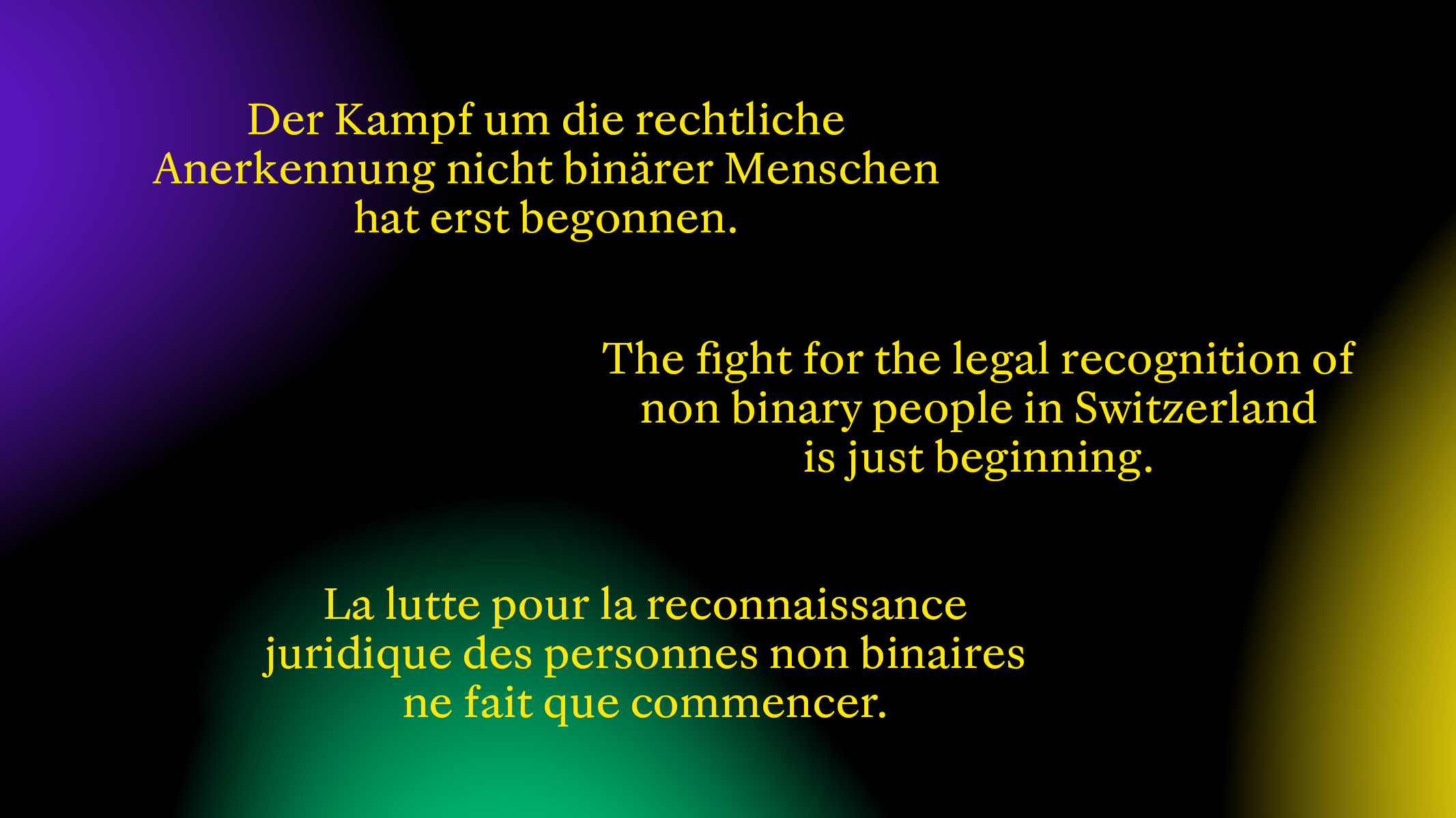 «Alle Menschen sind vor dem Gesetz gleich», sagt die Bundesverfassung. «Dann muss uns nicht binären Menschen das gleiche Recht auf staatliche Anerkennung zugestanden werden», antworte ich. Das Unrecht, das die Schweiz uns nicht binären Menschen heute antut, will ich beseitigen, und dabei auch meinen eigenen, seit eh und je störenden, Geschlechtseintrag endlich loswerden.