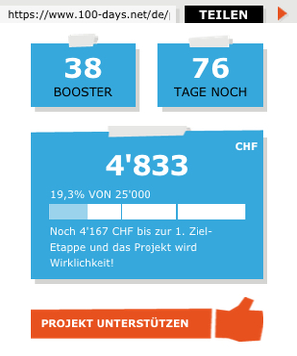 Um 11 Uhr sind die 90 Projekttage abgelaufen. Unser Projekt ist finanziert und mit +++ CHF 25‘368 +++ sogar über das Ziel hinausgeschossen!