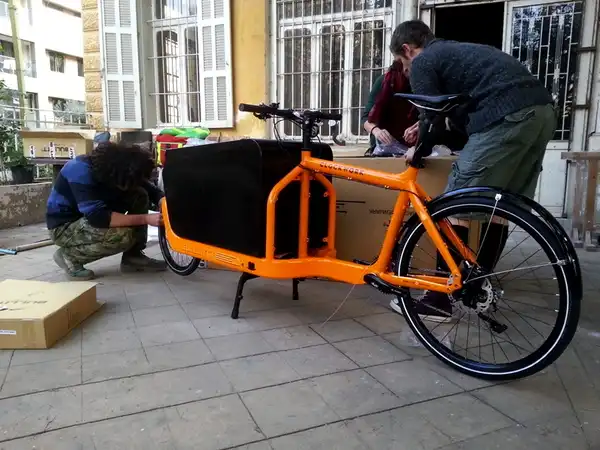 A fantastic boost came at the beginning of January in the form of a Bullitt cargo bike, donated by the Danish embassy - it fits perfectly into their mandate to promote Danish industry and Denmark's vibrant bicycle culture. The picture shows some of the team putting the bike together. This machine carries up to 60kg of cargo, and opens up many possibilities: we have started a collaboration with Souk el Tayeb, the upmarket farmer's market, to encourage market-goers to leave their car at home, come by bike or on foot, and send their groceries home with us.