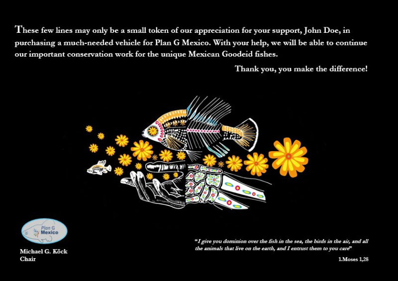 Plan G Mexico has been working successfully since October 2023 to protect Mexican goodeid fishes. It is supported by many stakeholders who are currently investing in nine individual projects. However, basic costs are hardly taken into account, and as our two vehicles in use are already old, we need to renew or expand our fleet in good time in order to be able to manage all projects. The support will be used to purchase a truck to close this gap.