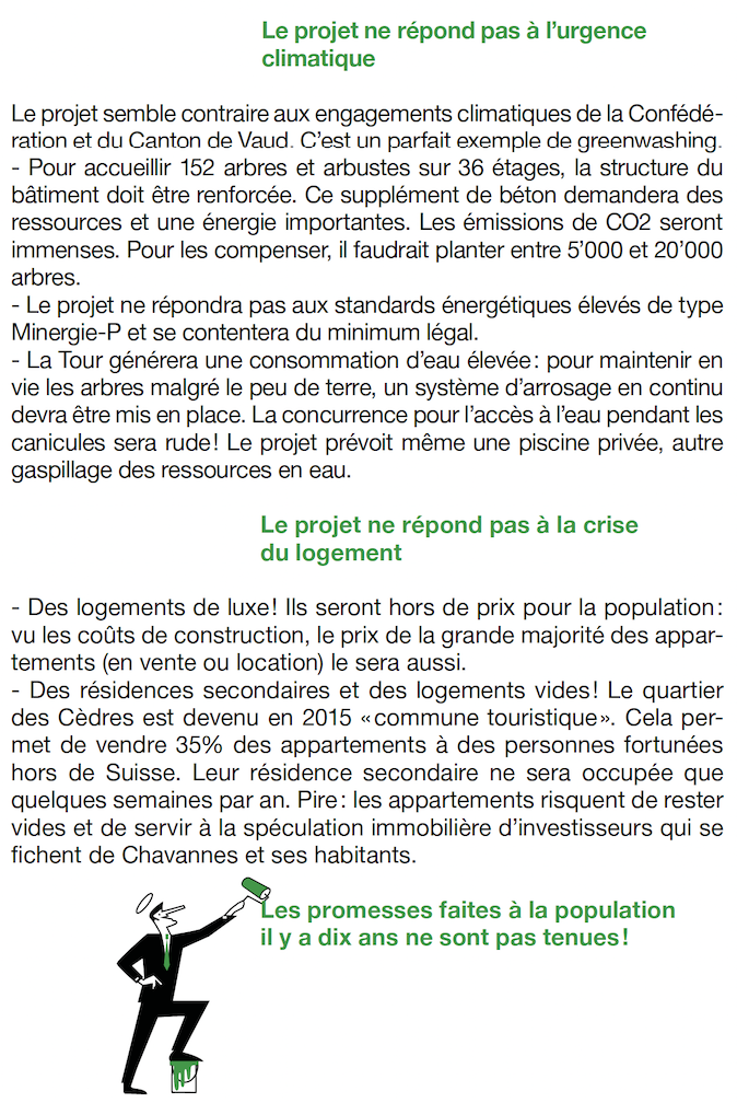 Chavannes-près-Renens : Tour des Cèdres, 36 étages, 120 mètres de haut, arbres en façade et pseudo parking déguisé en dépôt, avec des dérogations municipales pour les accès et l’arrosage. Projet écologiquement désastreux et socialement injuste, ne respectant pas les exigences du plan de quartier, au niveau de son programme, de sa matérialisation et de son exploitation.